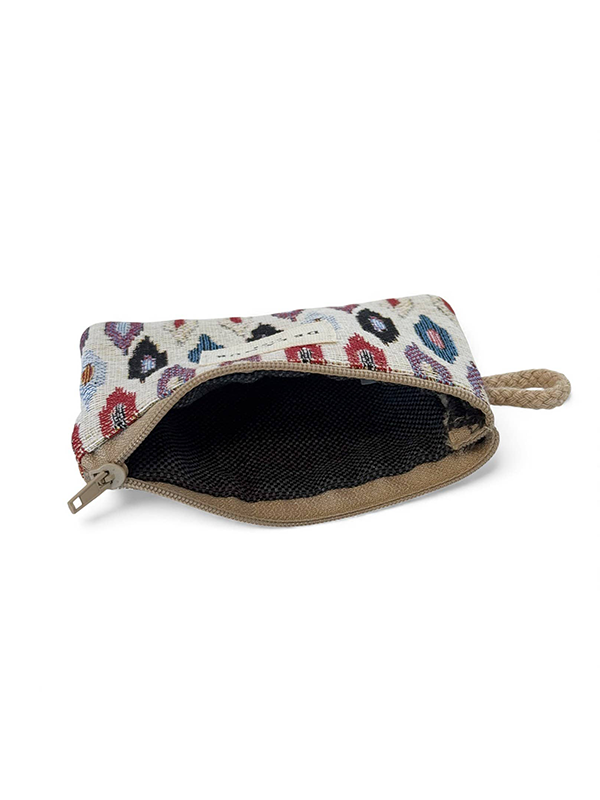✦ Zipper closure and small beige cord handle.