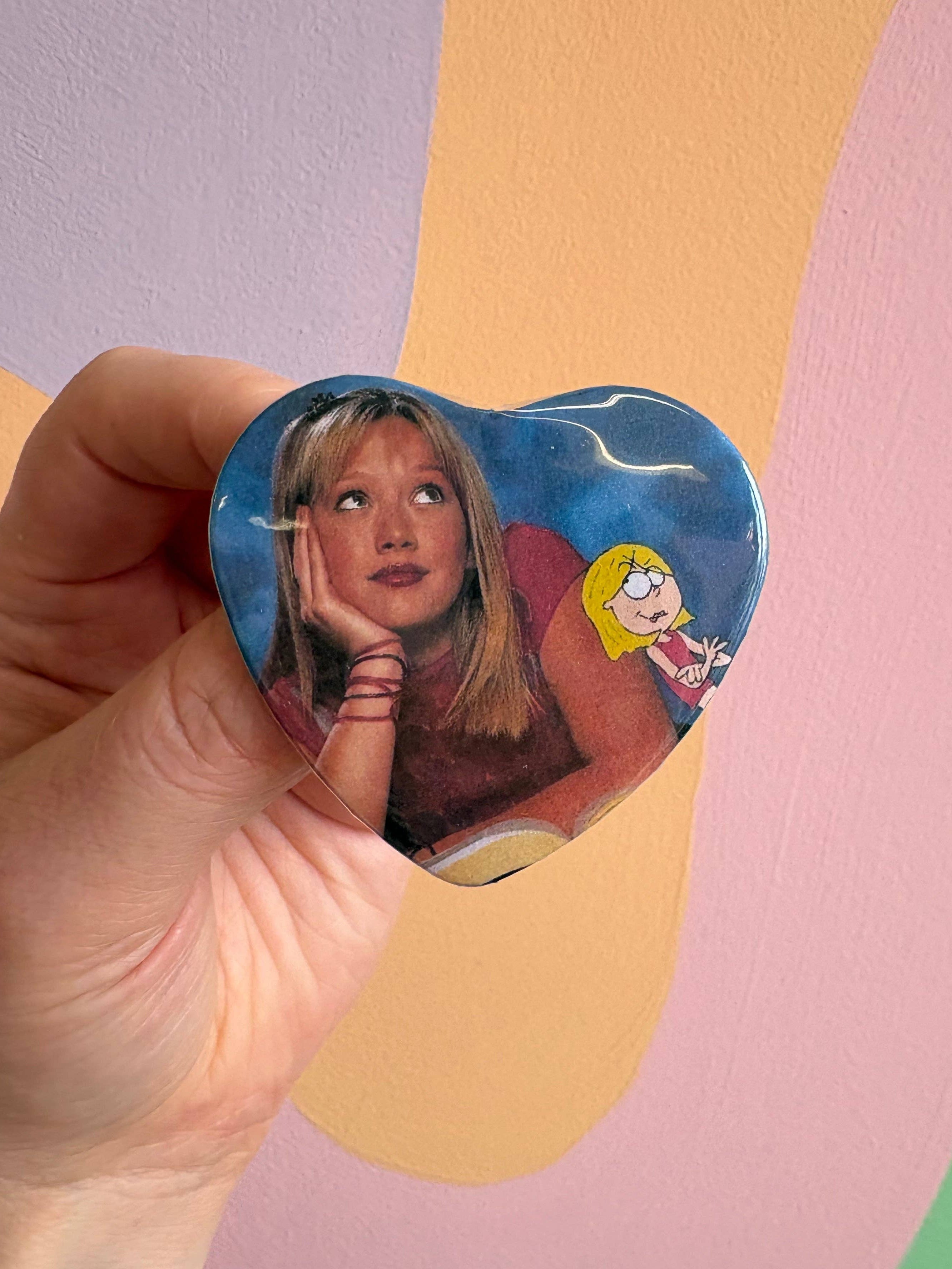 ✦ Heart-shaped pinback button.