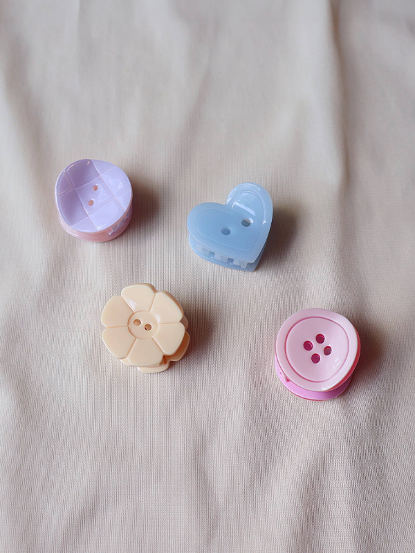 ⦠Includes four mini claws: round light pink, round lavender with carved lines, heart-shaped baby blue, and flower-shaped butter yellow.