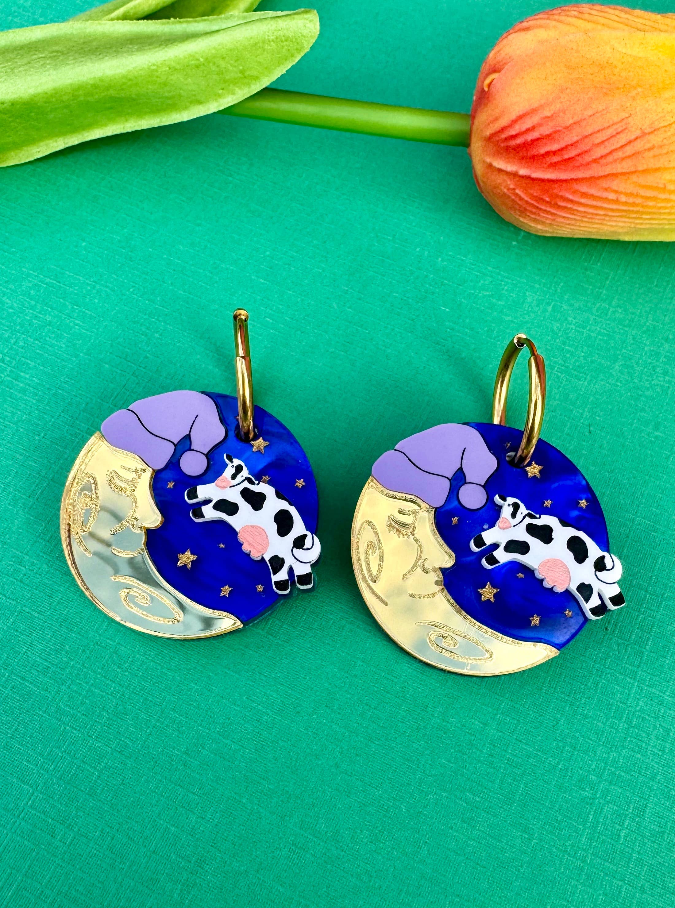 ⦠Lightweight, acrylic laser-cut earrings finished with hypoallergenic, anti-tarnish gold-plated stainless steel hoops.