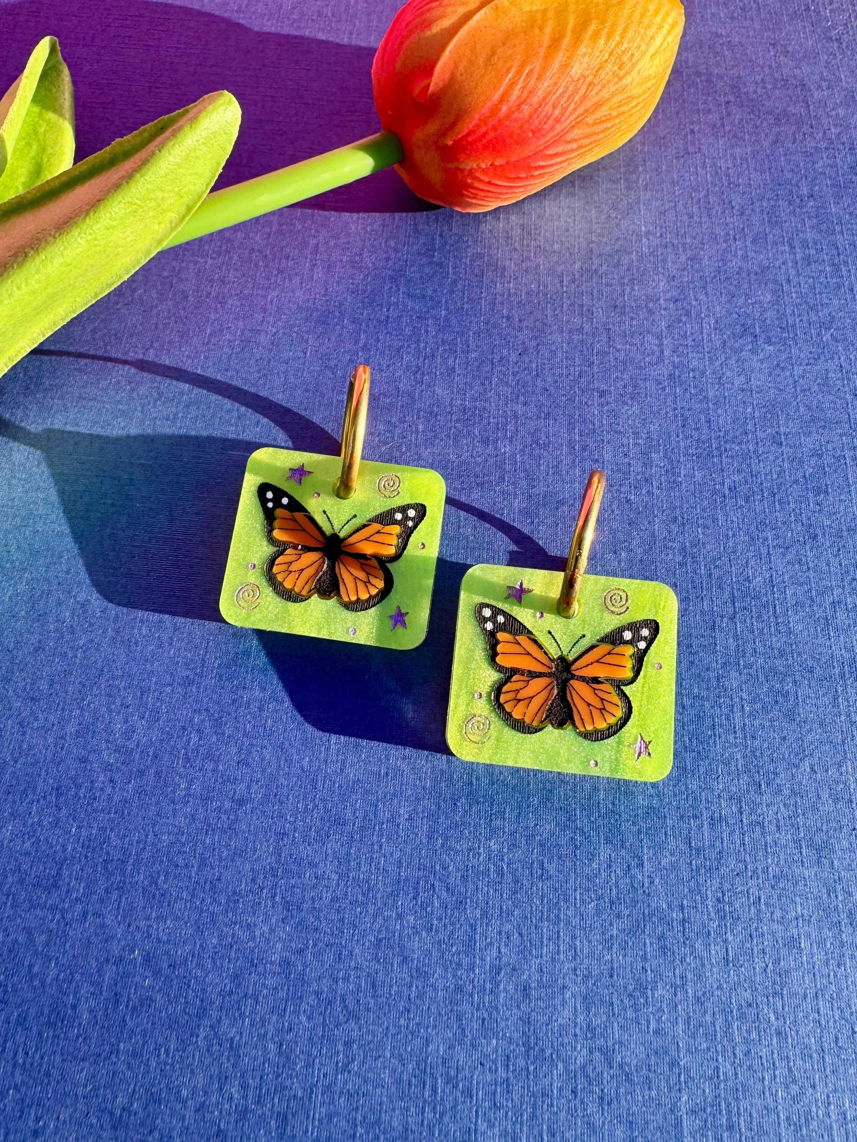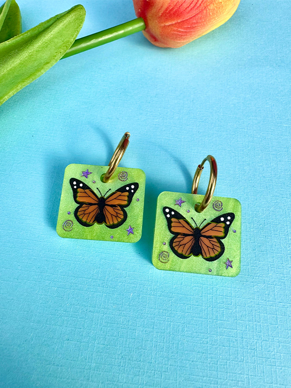 ✦ Lightweight, acrylic laser-cut earrings finished with hypoallergenic, anti-tarnish gold-plated stainless steel hoops.