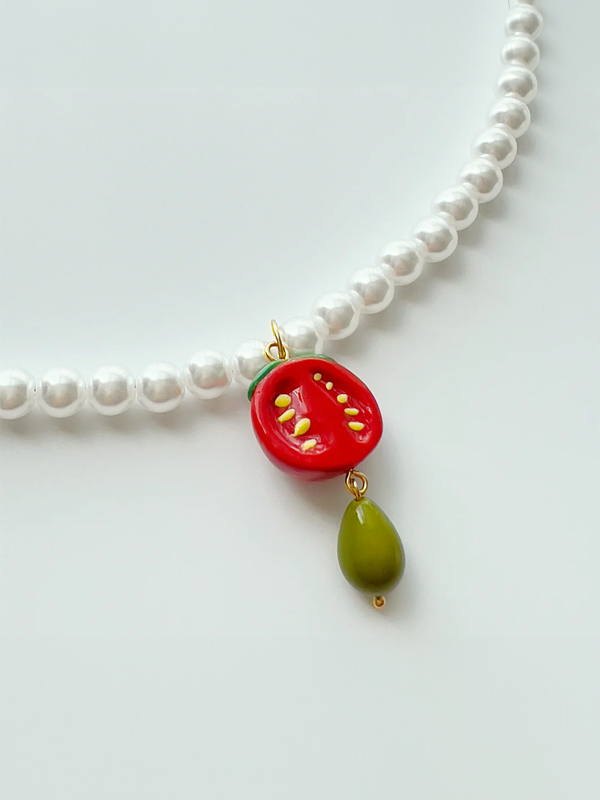 ✦ Handmade faux pearl and polymer charm necklace with gold plated hardware.