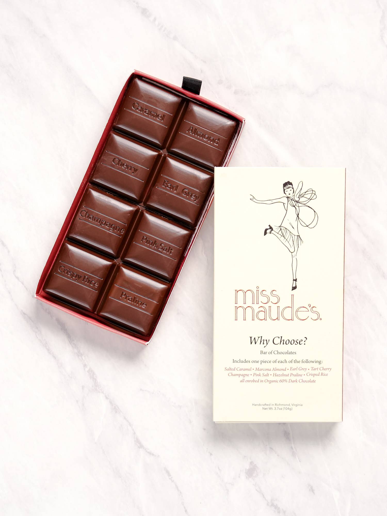 ✦ Flavors include Arabian salted caramel, Spanish marcona almonds, English earl grey, Peruvian pink salt, French Veuve Cliquot Champagne, Japanese tart cherry, Italian hazelnut praline, and Southern crisped rice, all enrobed in organic 60% dark chocolate.