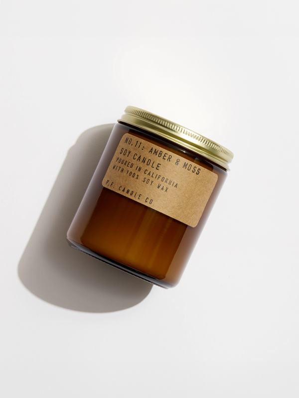 ✦ Hand-poured candle in an apothecary-inspired amber jar with a brass lid.