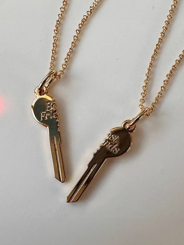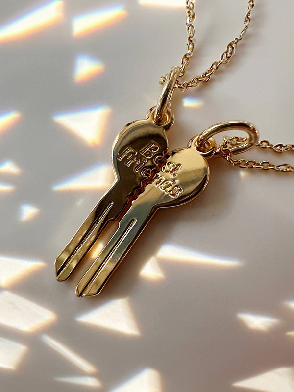 A heart-shaped key, split in half, inscribed with "best friends". Includes two necklaces.