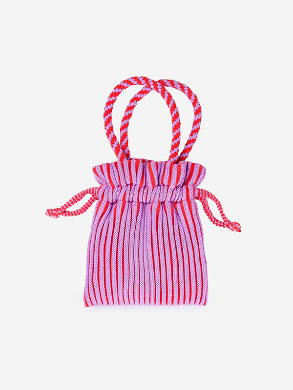 Fully lined, cheerful knit mini tote with hand-knotted macrame handles.