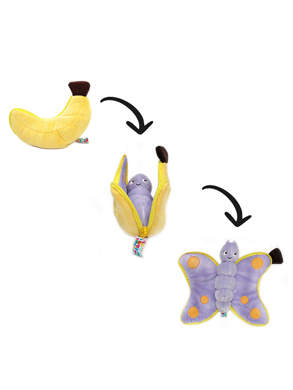 ✦ The banana plush unzips to transform into a beautiful butterfly, inspiring endless imagination.