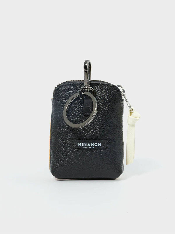 Made using embroidered genuine leather, printed cotton lining, and metal keyring.