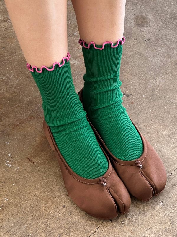 A sock born from our shared love of slow fashion, good design, and color combos that go with literally everything. The Ruffled Modal Socks feature a baby rib texture with a playful lettuce-edge ruffle at the top. Their versatile crew length makes them perfect worn long or scrunched down.
