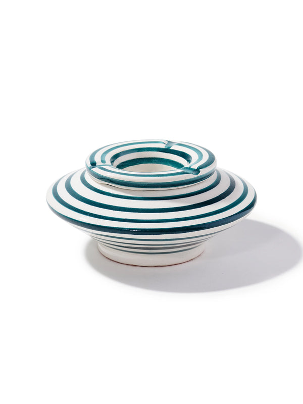 Handmade Moroccan Ceramic Spheroid Striped Ashtray: Green