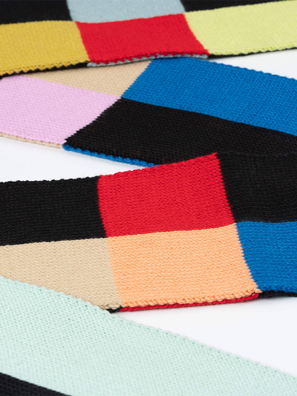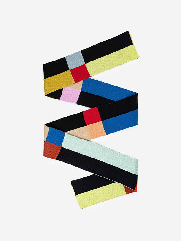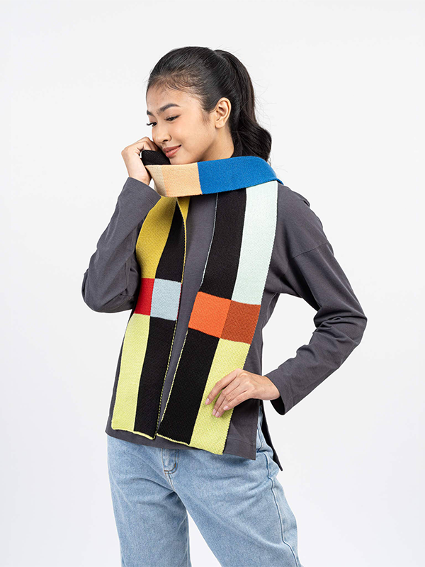 A vintage-inspired long skinny scarf knitted with bold colorblocking. 🟥✨