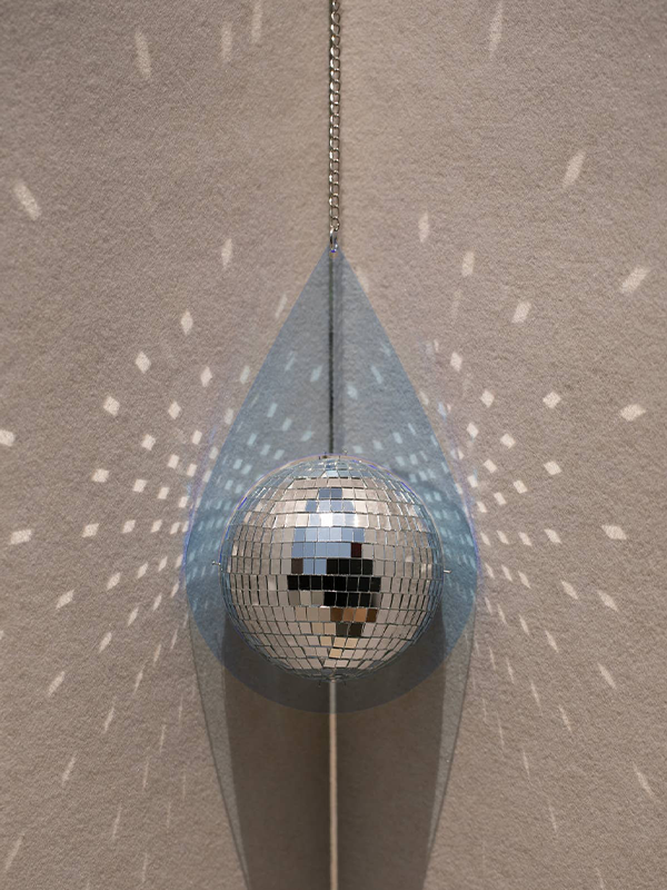 Acrylic frame measures approximately 9.25" tall with 4.5" disco ball and 7" chain.