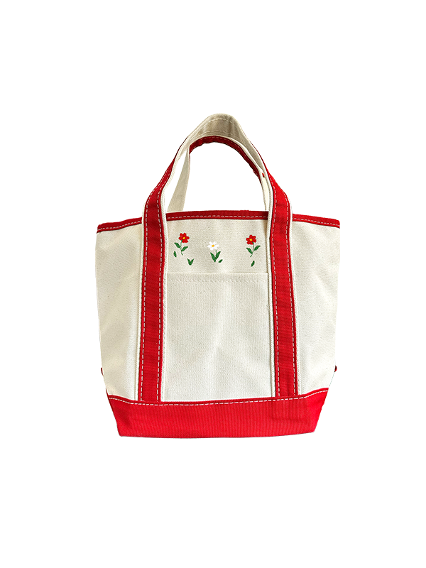 Vintage-inspired design stitched directly onto front of tote with lettering that reads "Forever Young", as well as an embroidered flower accent on the other side, located above the external pocket.