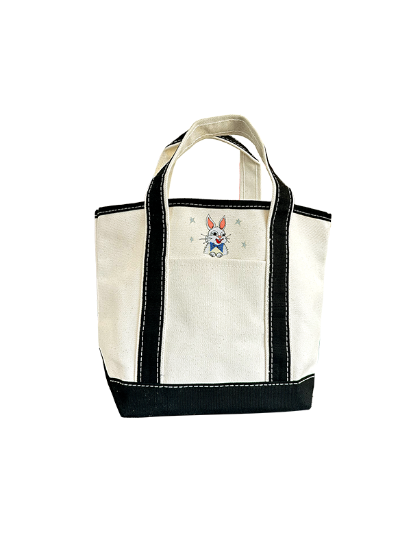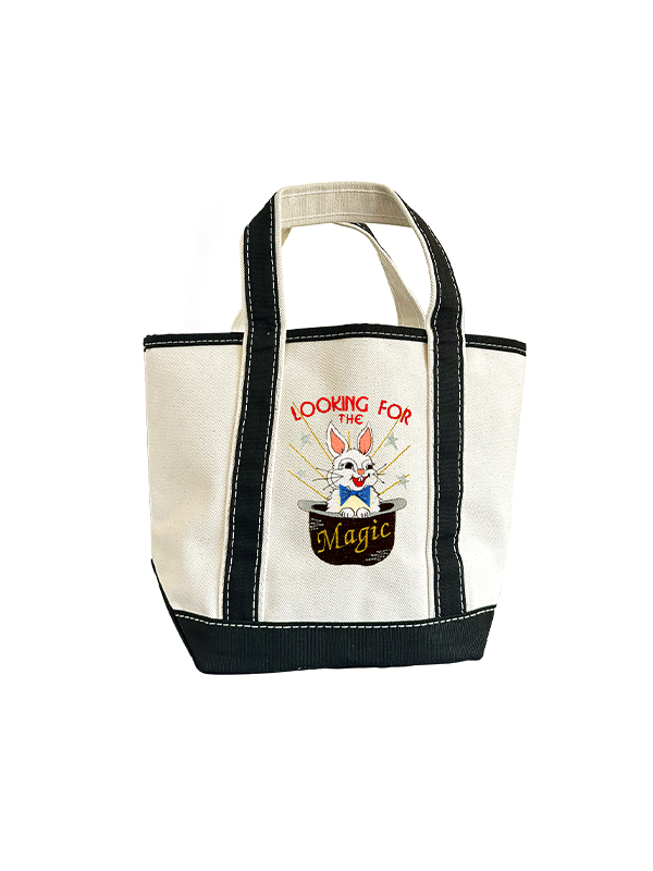 Vintage-inspired design stitched directly onto front of tote with lettering that reads "Looking for the Magic", as well as an embroidered rabbit accent on the other side, located above the external pocket.