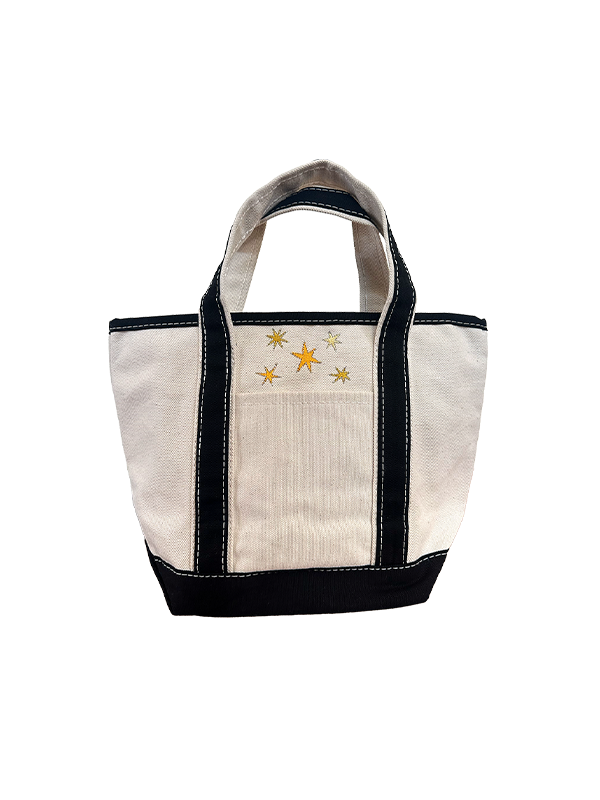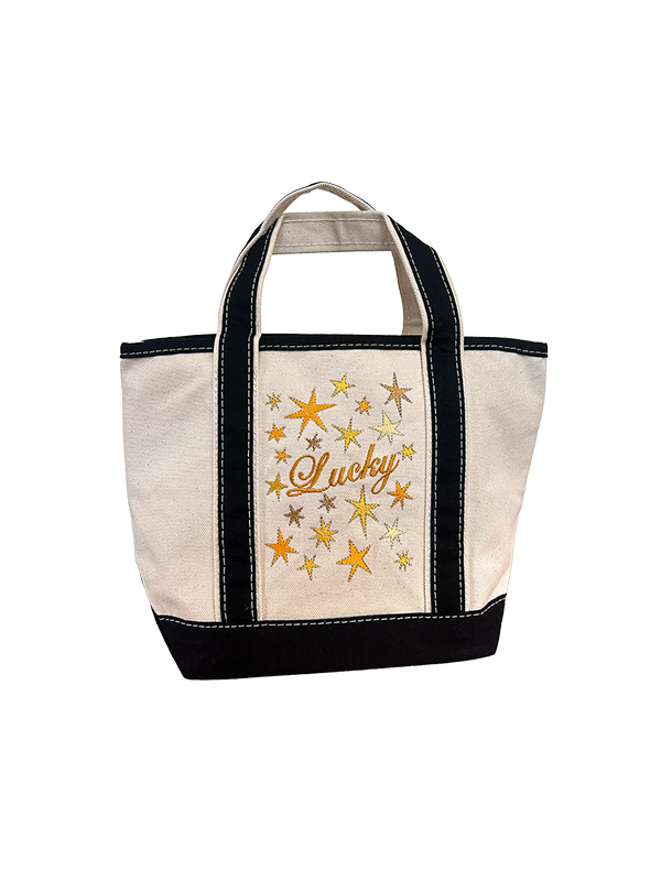 Vintage-inspired design stitched directly onto front of tote with lettering that reads "Lucky", as well as an embroidered star accent on the other side, located above the external pocket.