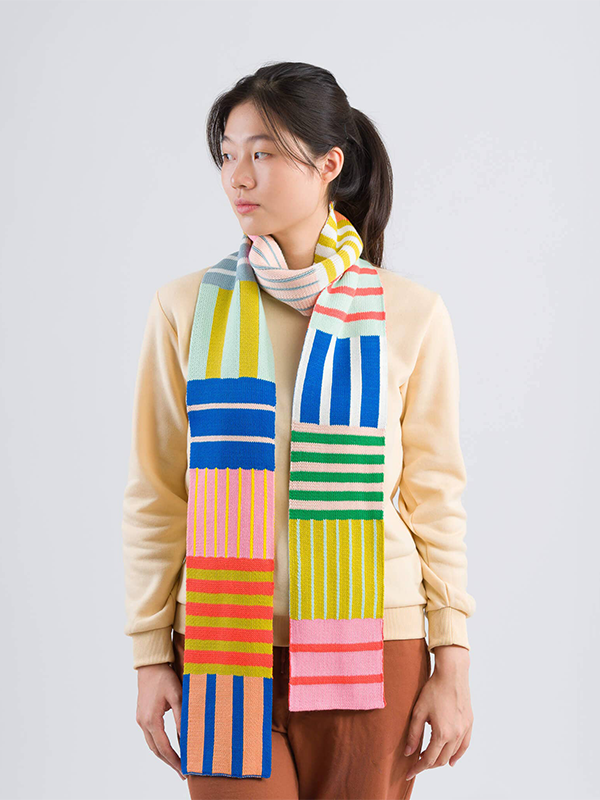 A vintage-inspired long skinny scarf knitted with a patchwork mix of two-tone stripes. 🌈✨