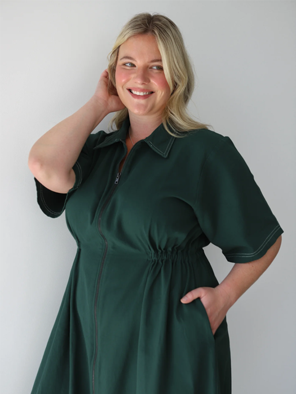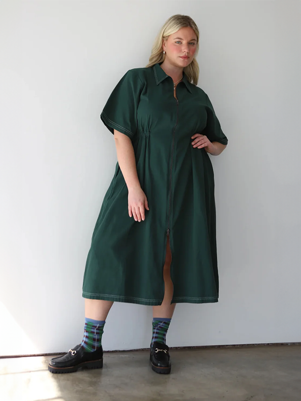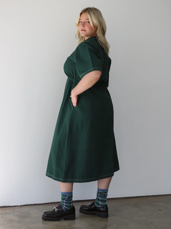 Noble's signature Utility Dress now in a LONGER LENGTH (😍) features oversized sleeves and a cinched elastic waist and full skirt for a flattering, comfortable fit. BONUS: giant pockets for all of your stuff!