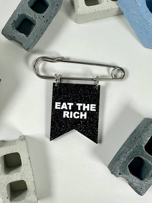 ✦ Safety pin with laser cut glitter black acrylic banner and hand painted white lettering.