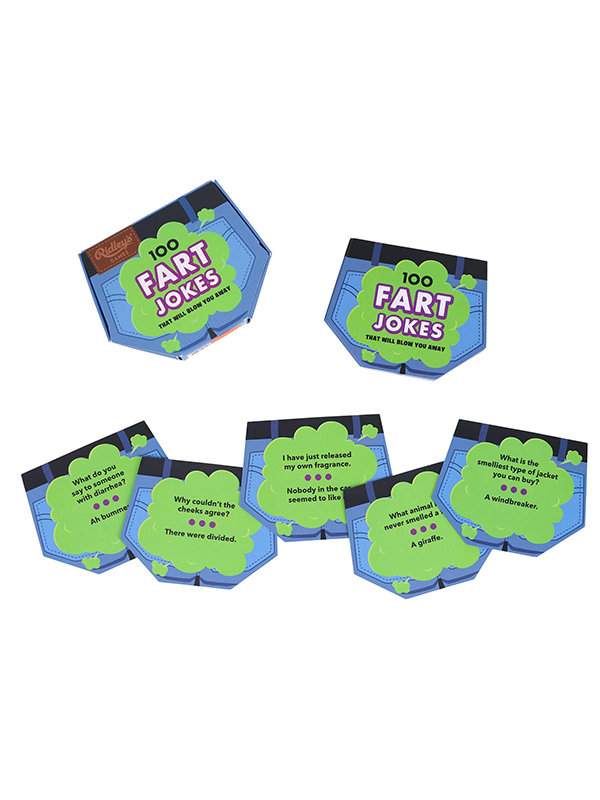 Includes cheeky puns and stinky sarcasm that will blow you away! Packaged in a butt-shaped box, these joke cards are perfect for entertaining kids and making grown-ups giggle.