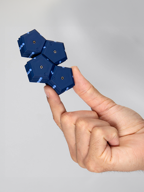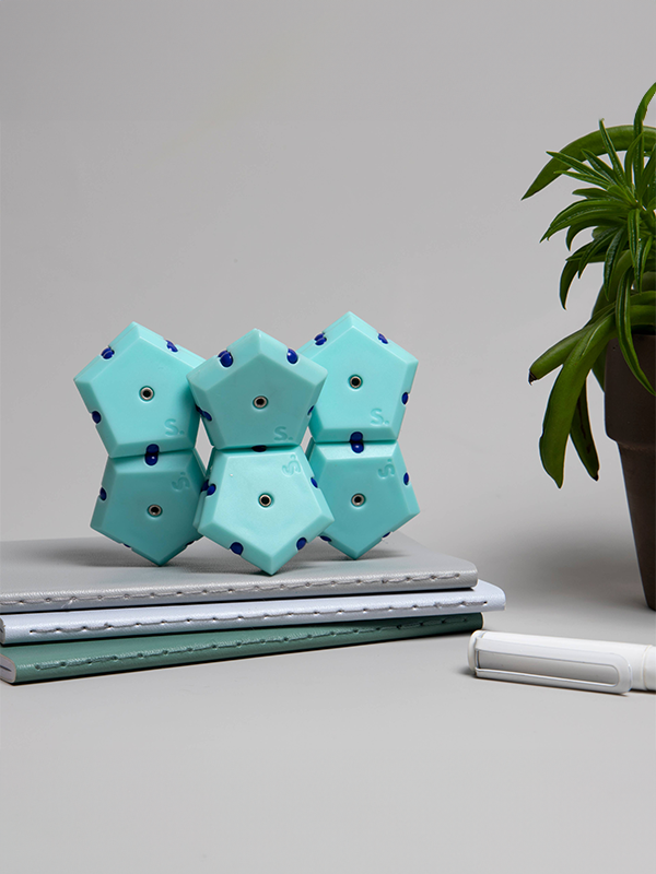 A set of 12 triangles or pentagons with magnets on every end to build and fidget with. Smash the sphere and stack the tiles into unlimited shapes!