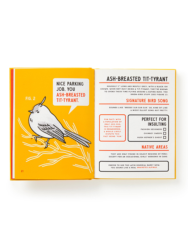 Impress people with both bird knowledge and witty comebacks. Itβs a bird guide disguised as comedy gold! Inside you'll find a comprehensive, illustrated guide to 75 of our species β based solely on how well their names roll off our tongues when we're mad. These are real birds by the way, which really makes you wonder what was going on the day they named 'roufous-rumped seedeater.' Geez, take it down a notch.
