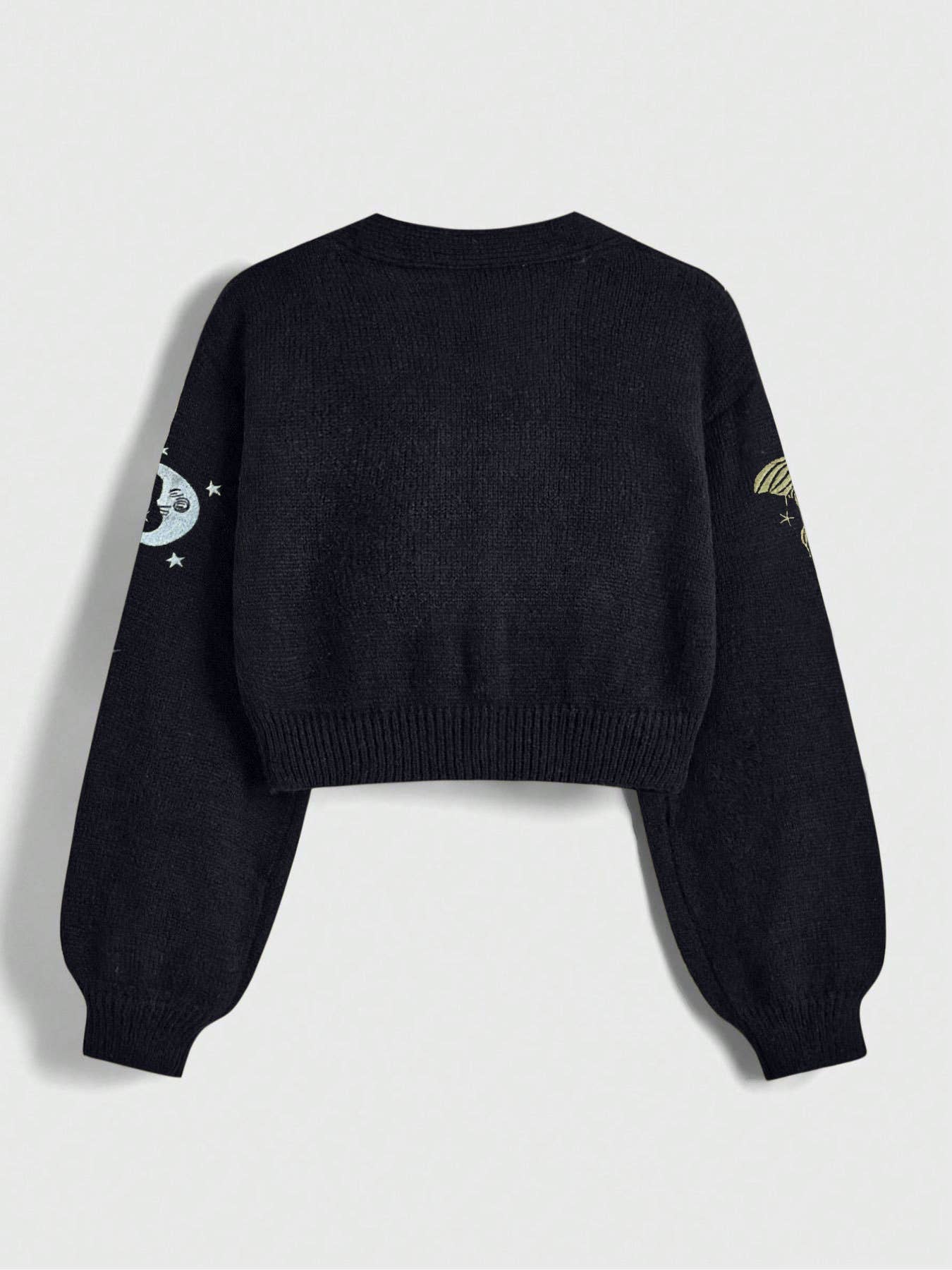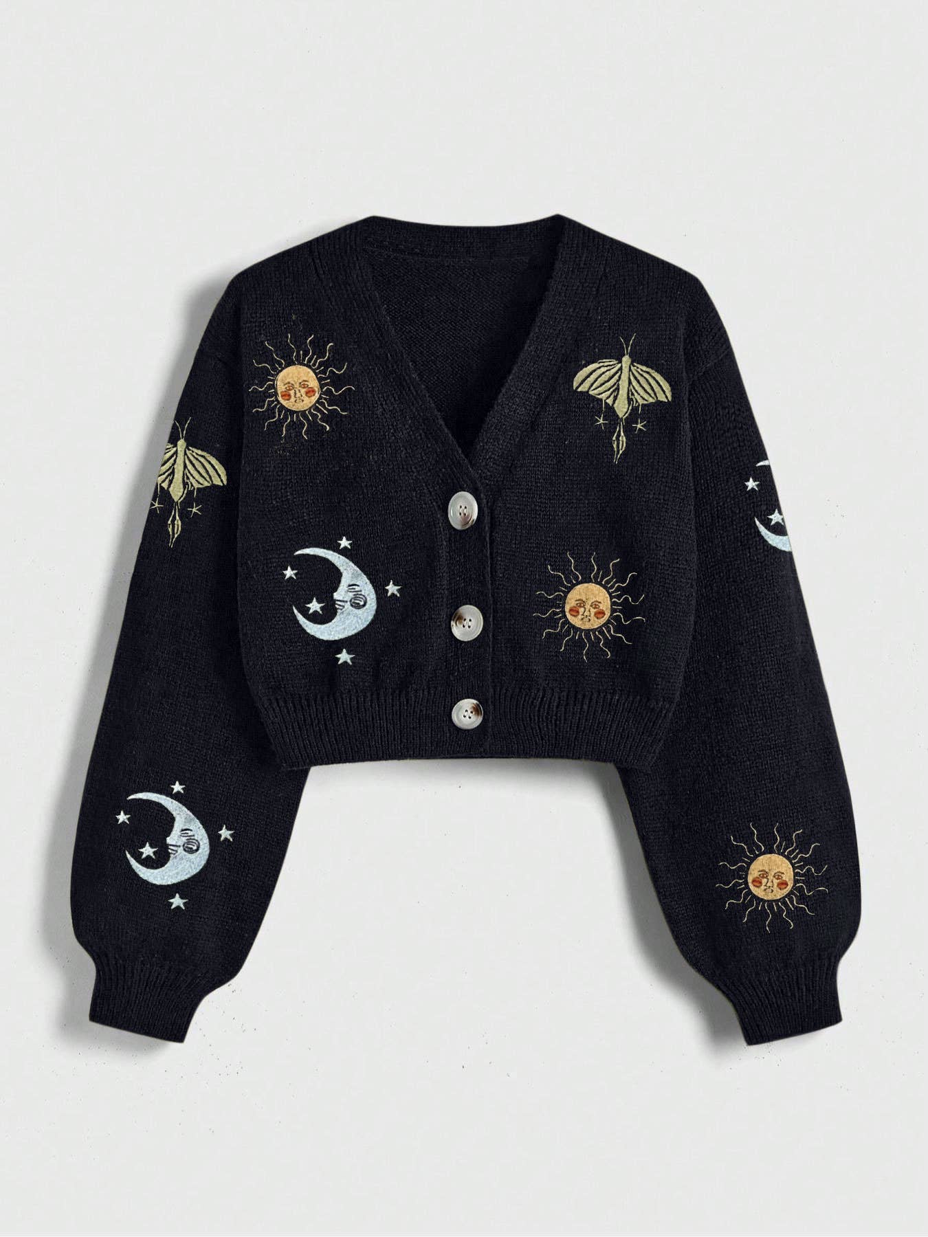 Mysterious Universe Sun & Moon Embroidered Cardigan: Black