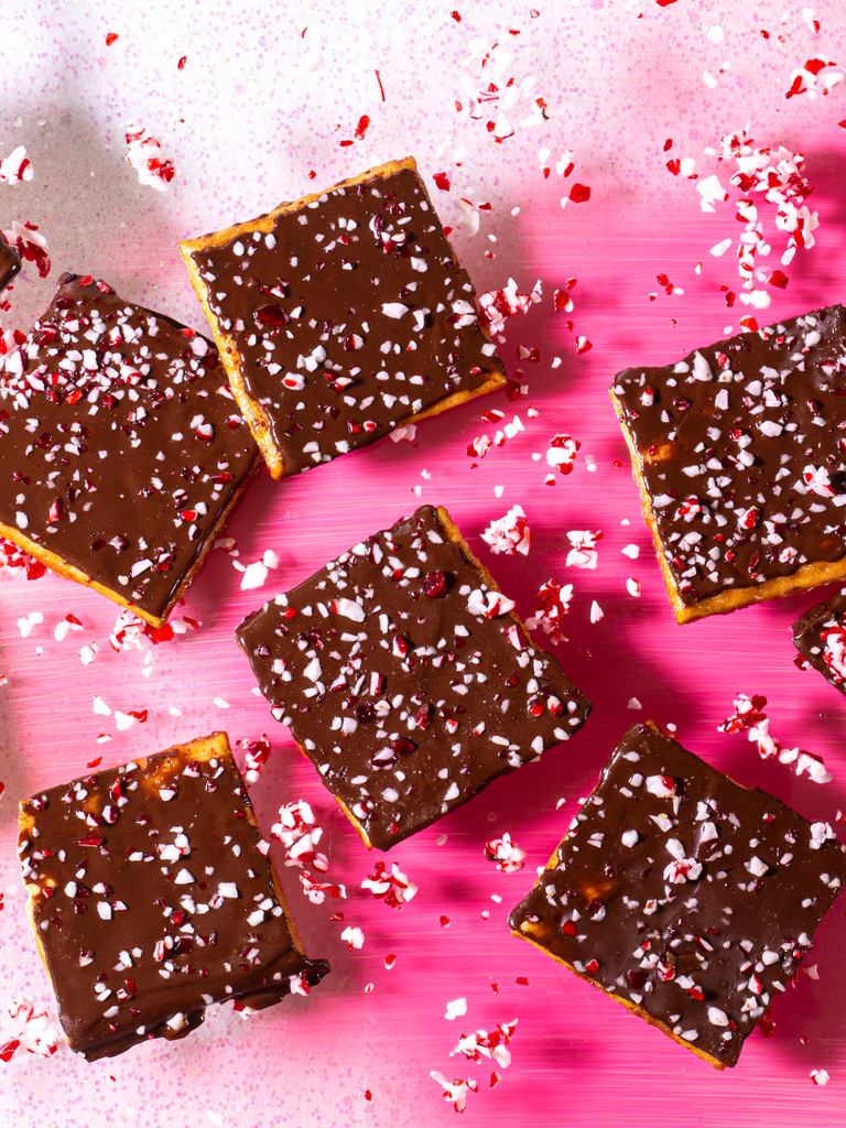 ⦠A crispy cracker base, salted handmade toffee, ethically sourced semi-sweet chocolate, and sprinkled with crushed peppermint.
