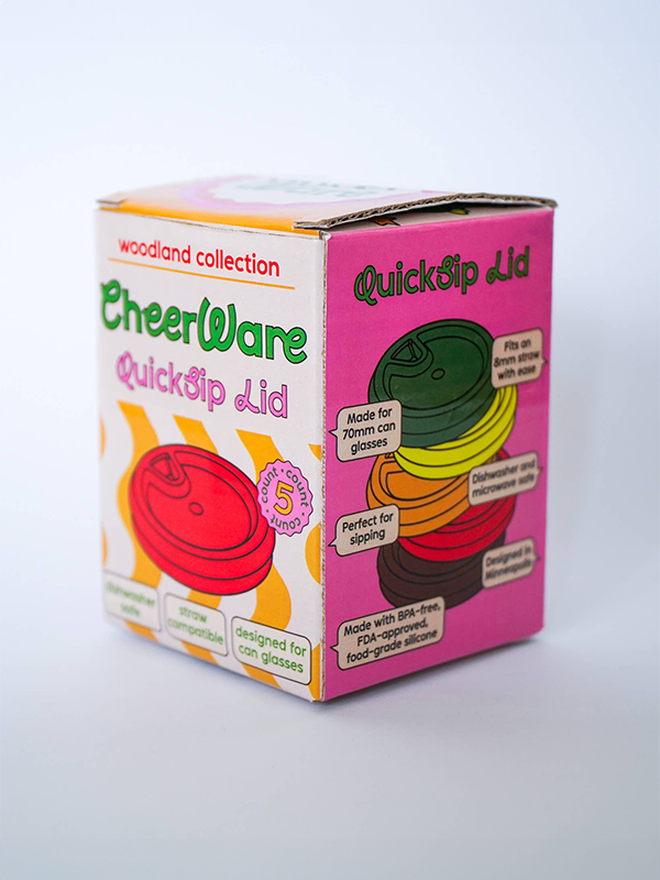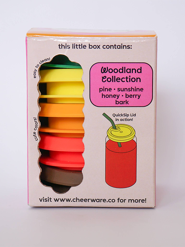 ✦ Set of 5 reusable lids in various colors: pine green, sunshine yellow, honey gold, berry red, and bark brown.
