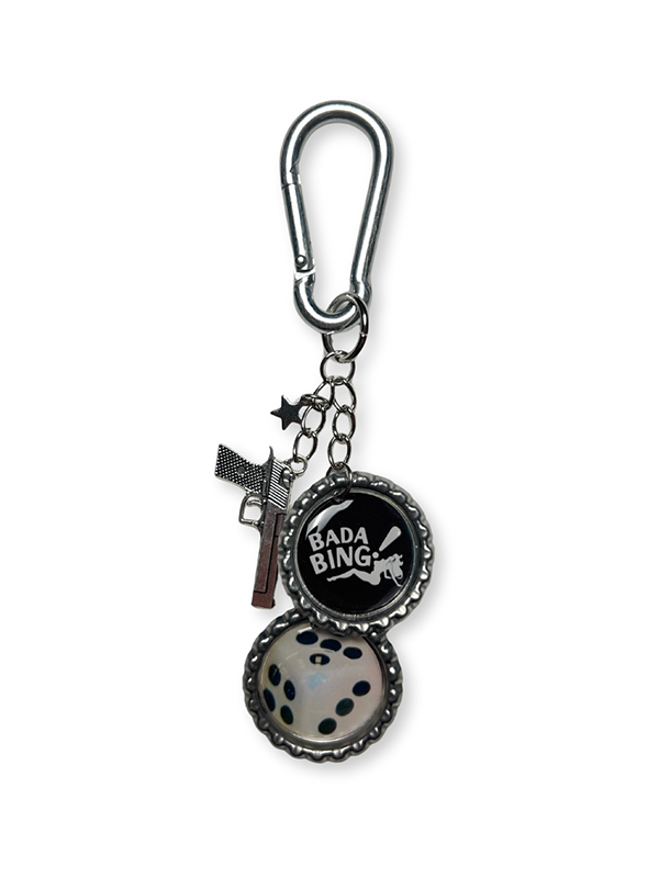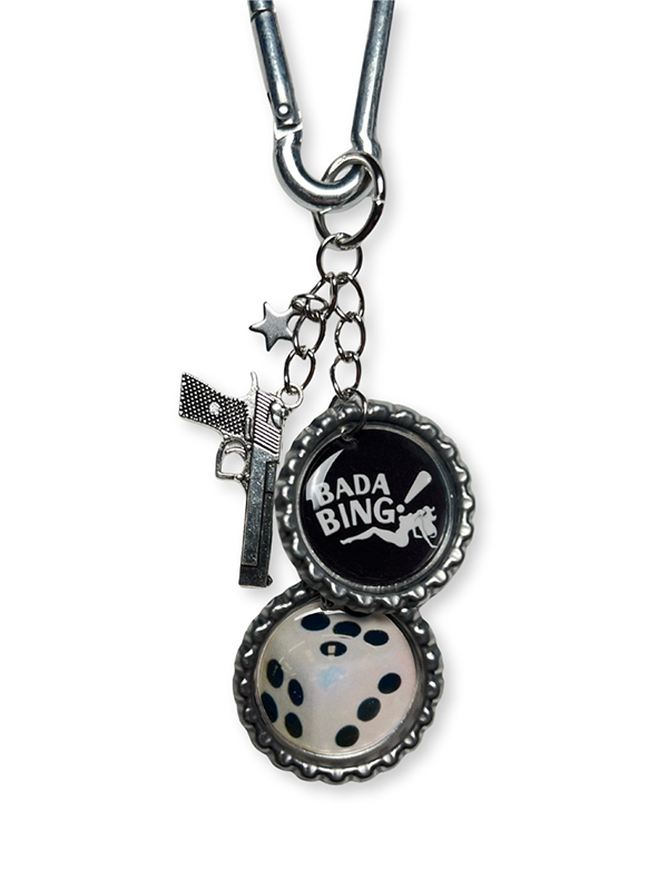 ✦ Bag charm inspired by The Sopranos, made with repurposed aluminum bottle caps and silver charms.