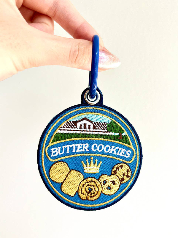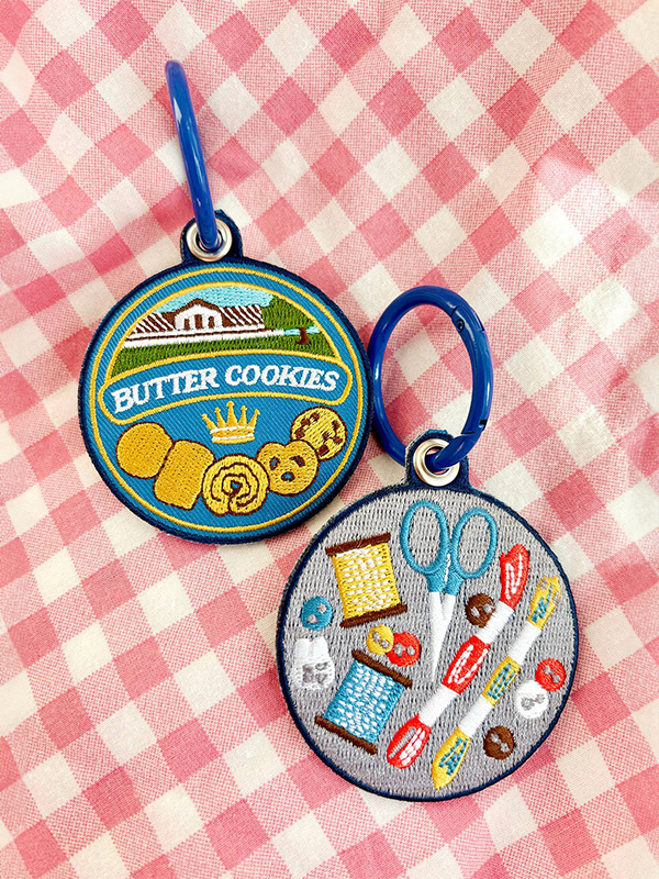 β¦ Embroidered keychain featuring a butter cookie tin on one side + surprise sewing kit on the other.