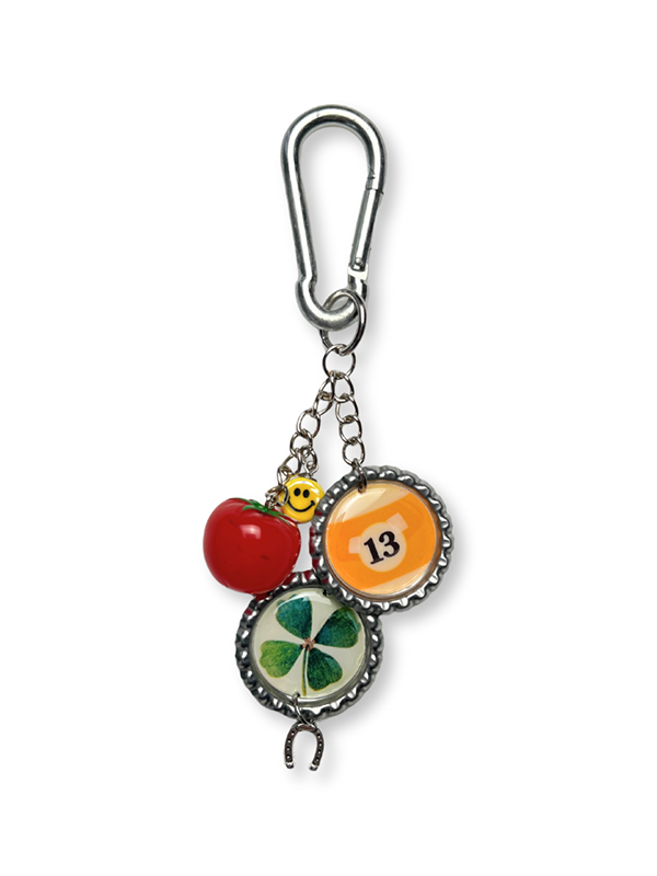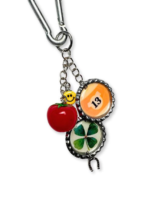 ✦ Bag charm crafted with repurposed aluminum bottle caps and charms.
