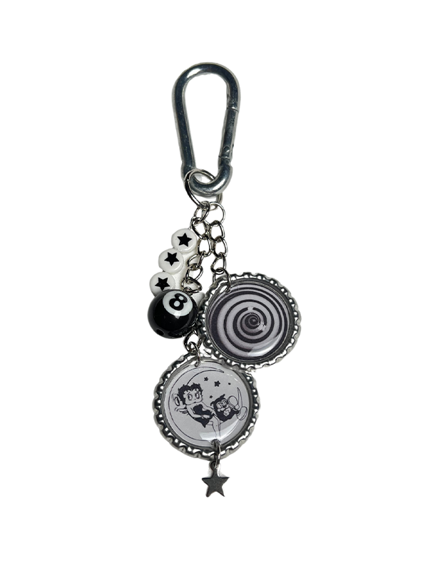 ✦ Bag charm crafted with repurposed aluminum bottle caps and charms.