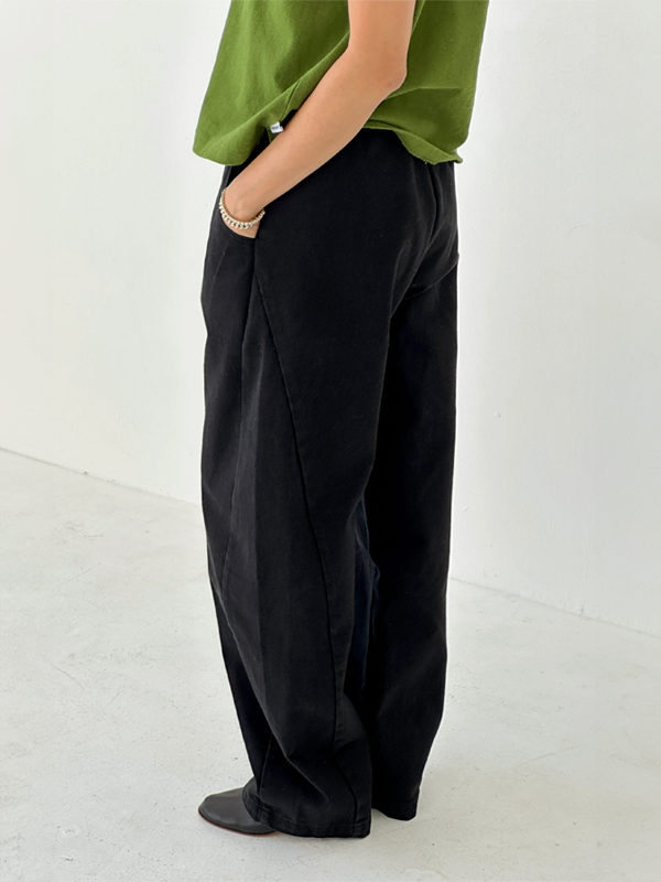 ✦ An elastic waist tops a slightly curved leg with a unique arced side seam and panels, along with side pockets.
