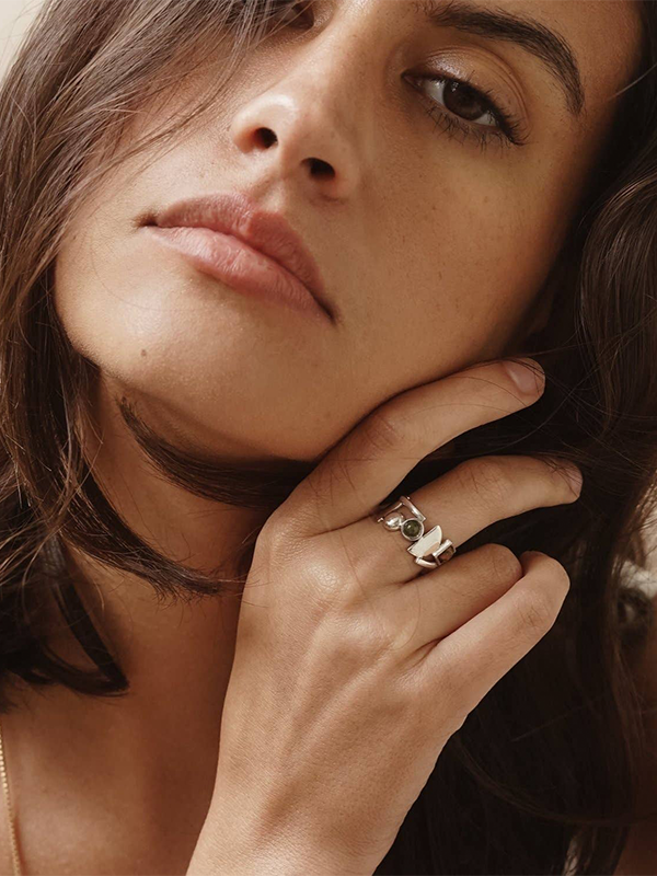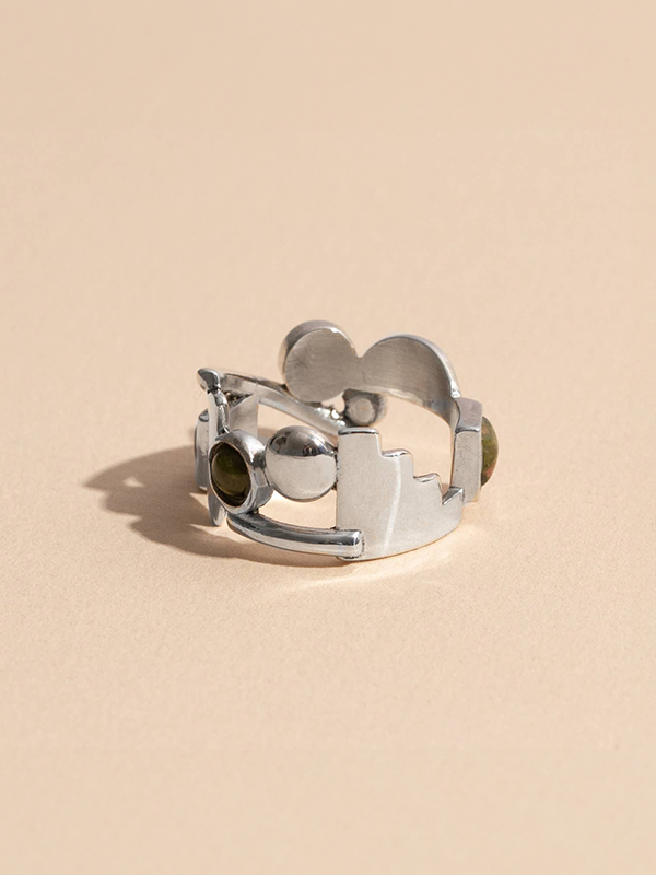 ✦ Features a collection of circle and square stones wrapped around metallic semi-circle, rectangle, and bar shapes.