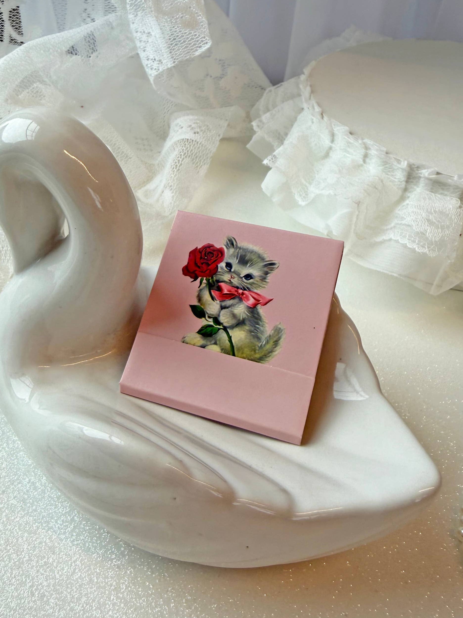 ✦ Open the matchbook to uncover 10 pink-tipped matches, printed with a rose.