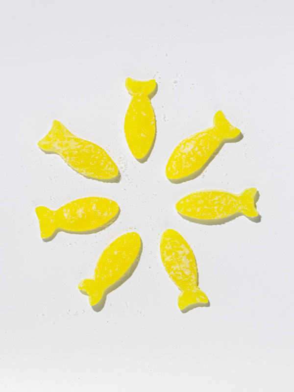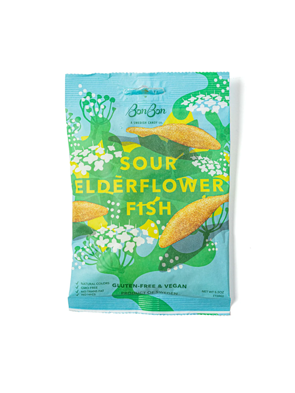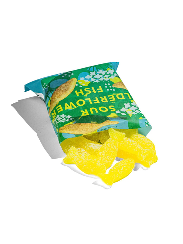 Ingredients: sugar, invert sugar syrup, water, glucose syrup, corn starch, citric acid, tartaric acid, natural flavor elderflower type, turmeric oleorecin (color), coconut oil, carnauba wax.