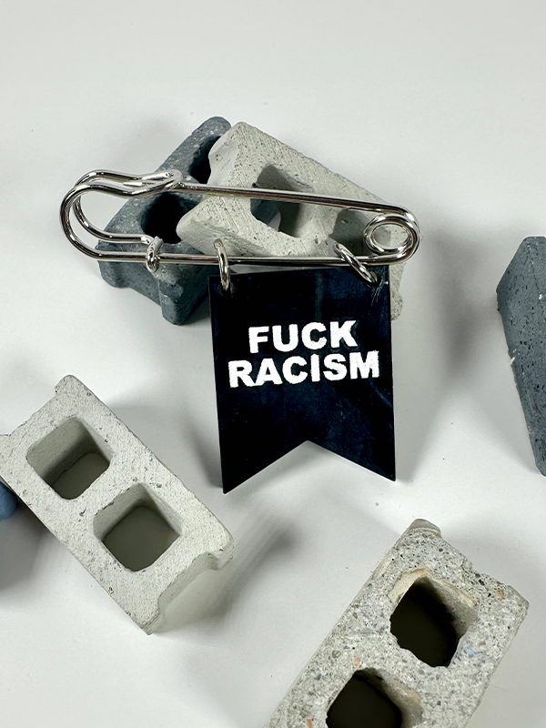 ⦠Safety pin with laser cut pearl black acrylic banner and hand painted white lettering.