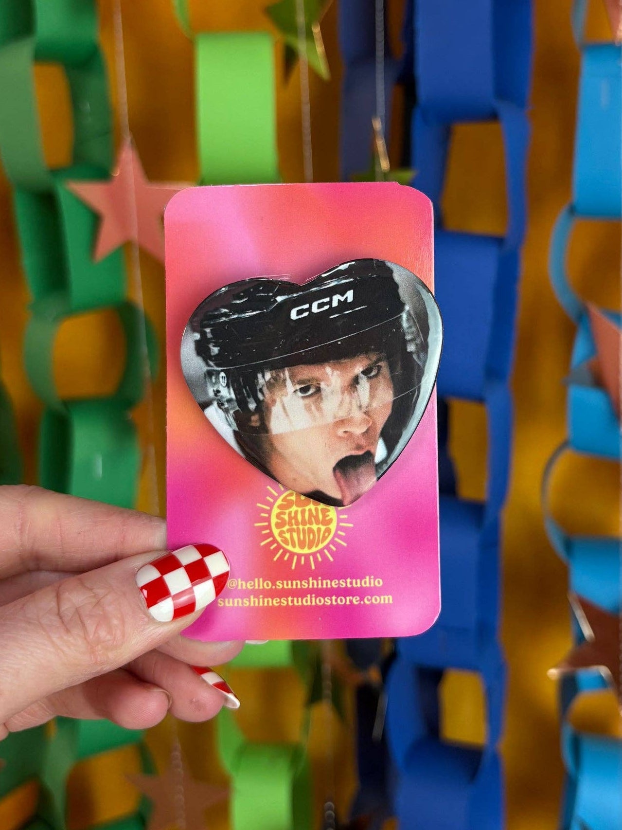 ✦ Heart-shaped pinback button.