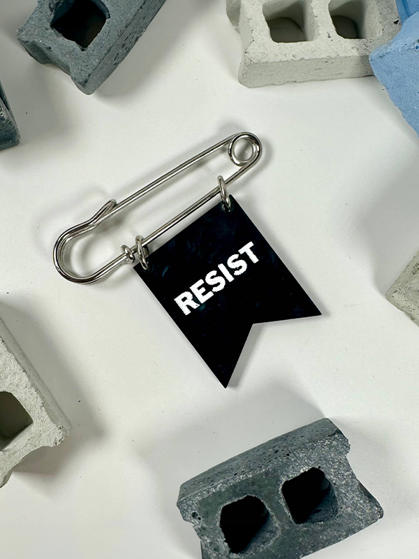 ✦ Safety pin with laser cut pearl black acrylic banner and hand painted white lettering.