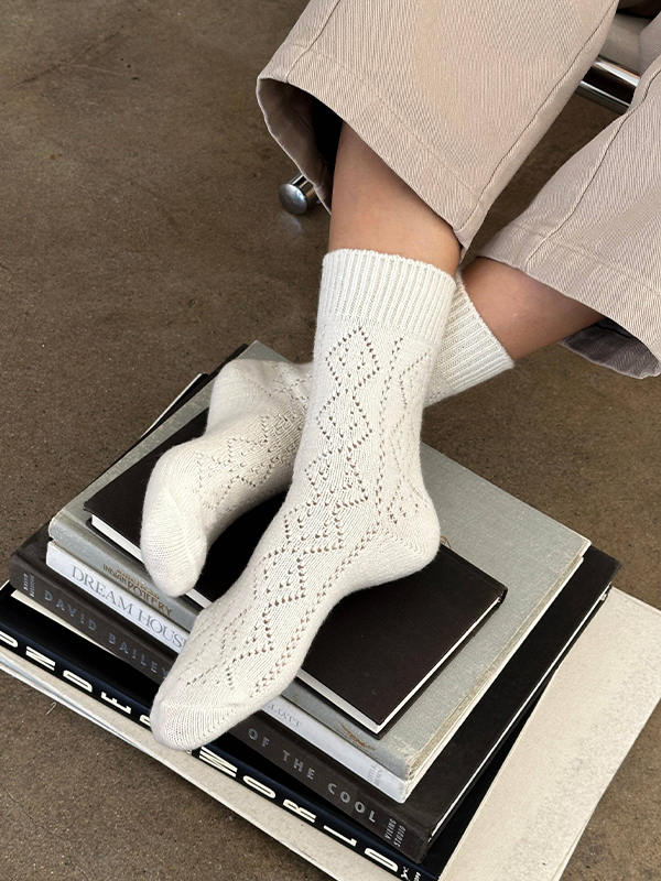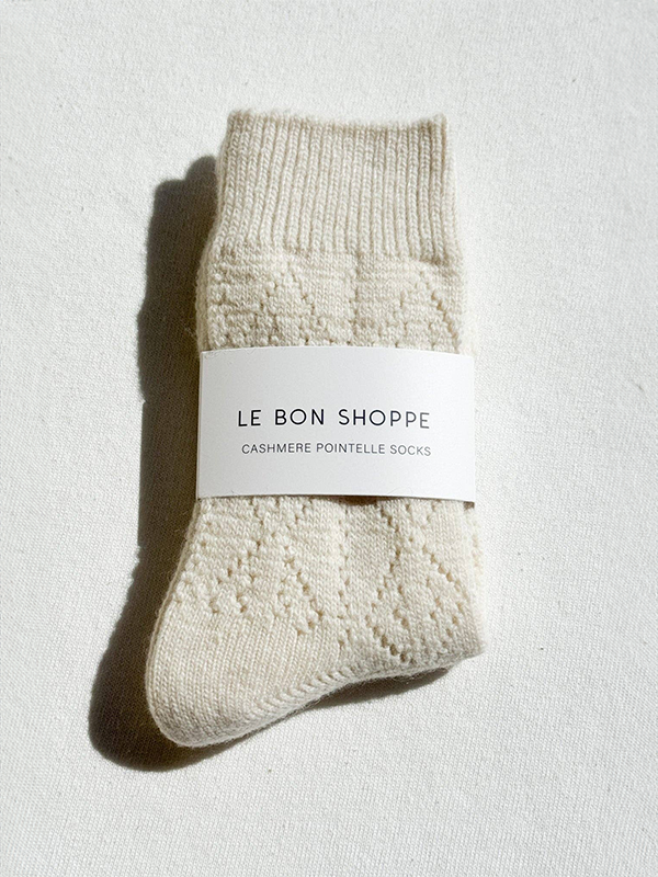 A crew-length silhouette with ribbed detail at the top and a delicate pointelle knit that adds just the right amount of sweetness to any look.