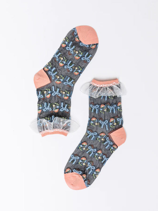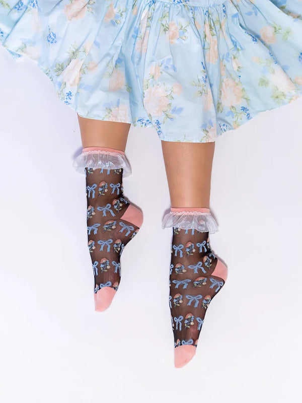 Inspired by the Bridgerton regency era, this ruffle ankle sock features pastel florals and sweet bows set against black sheer fabric. Finished with a white sheer ruffle cuff for maximum girlishness. ✨