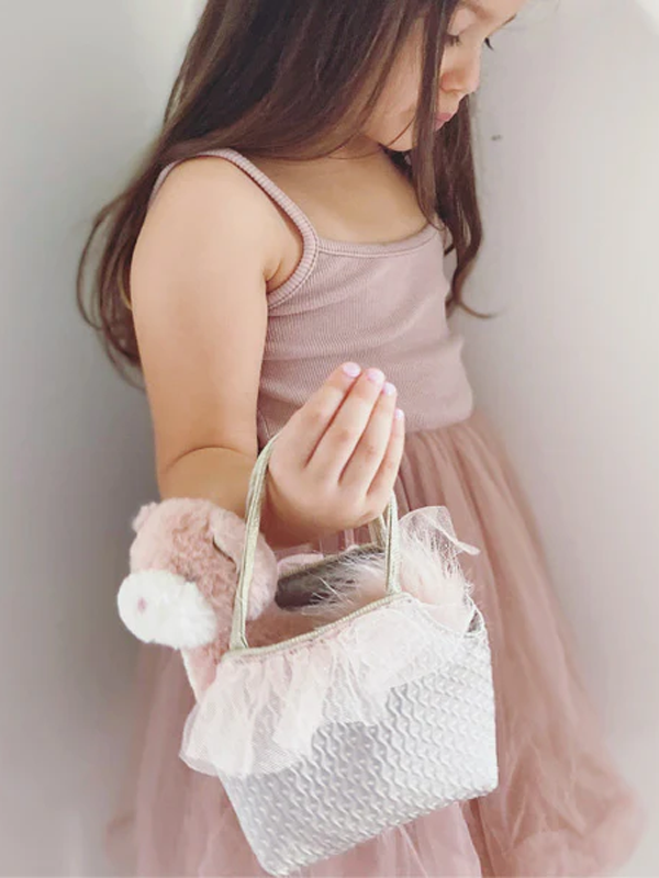 A mini sized Callie the kitty in a beautiful satin bag, trimmed in soft pink tulle and gold handle.Ā