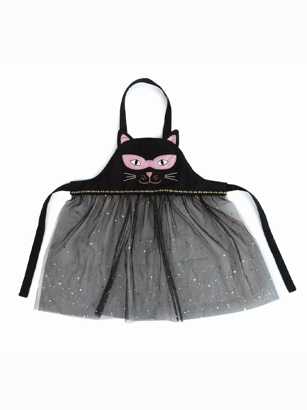 This costume-worthy play apron purrrfectly pairs a bewitching black cat with an ethereal tulle skirt sprinkled in sparkle. Long ties let you adjust the fit of this chic cat witch apron on your frighteningly-cute feline.
