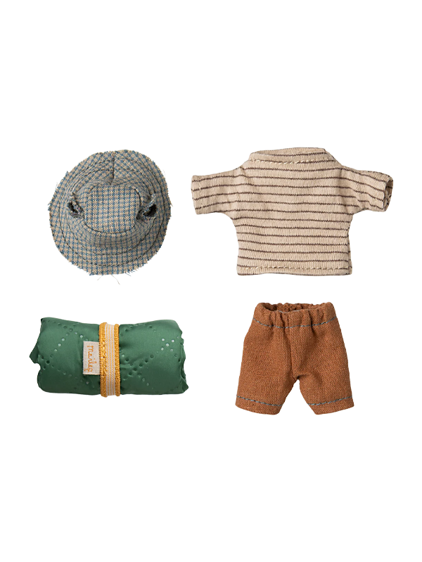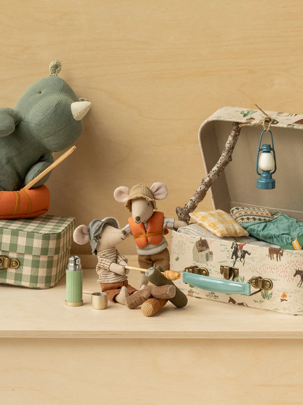 Dressed for a day of walking and exploring, he carries her sleeping bag on her back, perfect for cozy nights under the stars. His magnetic paws help him hold all her essential hiking gear.
