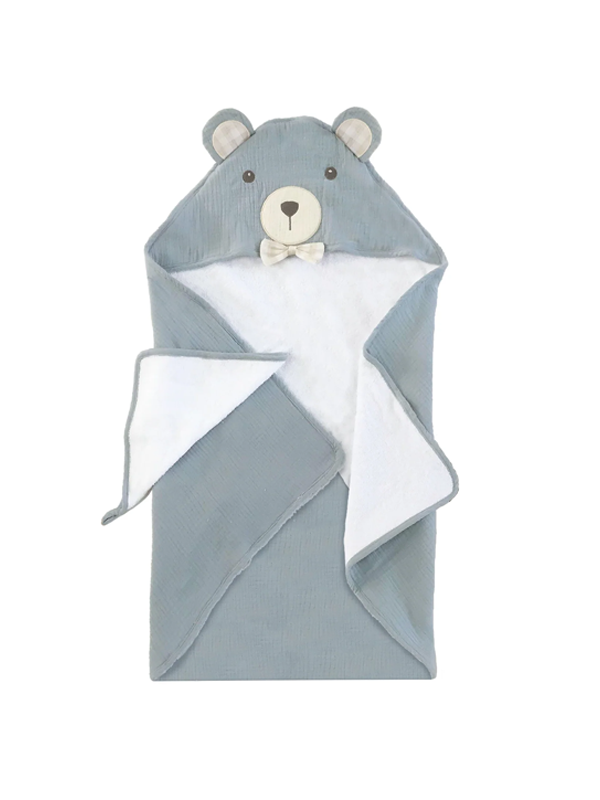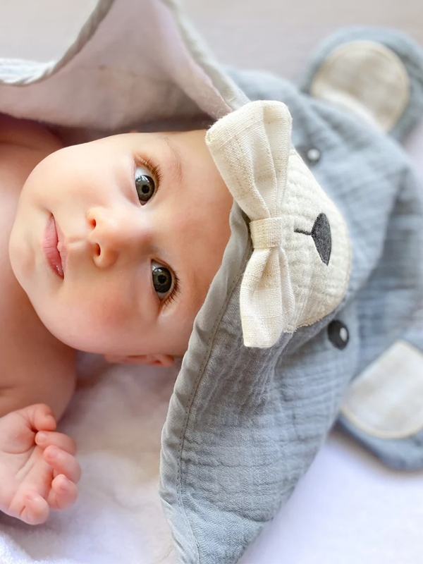 Hooded terry cotton towel with muslin top layer and a super soft washcloth in a matching pattern.