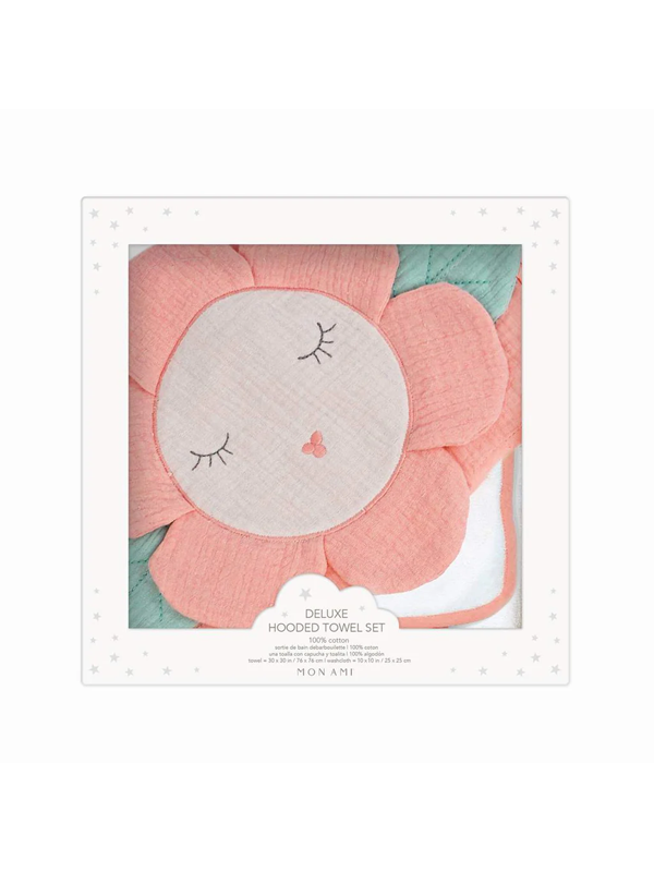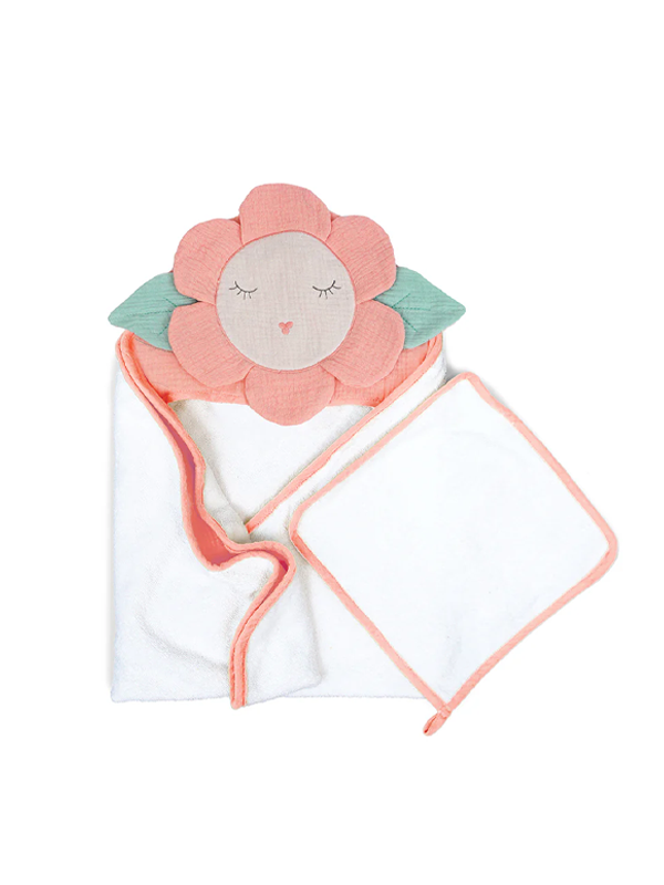 Hooded terry cotton towel with muslin top layer and a super soft washcloth in a matching pattern.