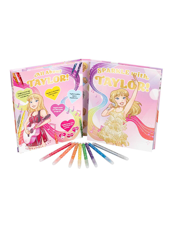 Color the biggest pop star in the world as she tours around the globe, writes songs, spends time with friends, and takes on the music industry! Use the included 8 glitter markers to bring the show-stopping scenes of Taylor Swift to life. Whether she’s at a dance rehearsal, recording in the studio, or going to a football game, the captivating scenes in this glimmering coloring kit show Taylor being the superstar we all know and love. With 30+ glitter stickers, this coloring kit is the perfect way for Swifties to start their glitter era with Taylor!