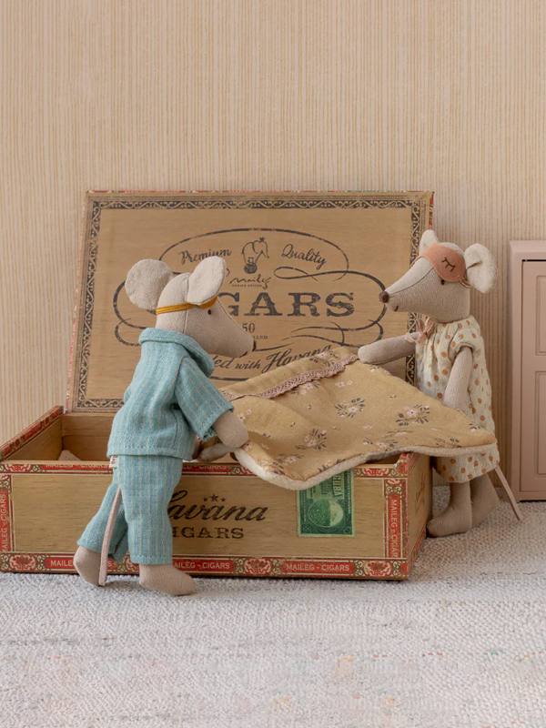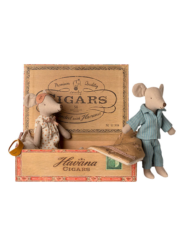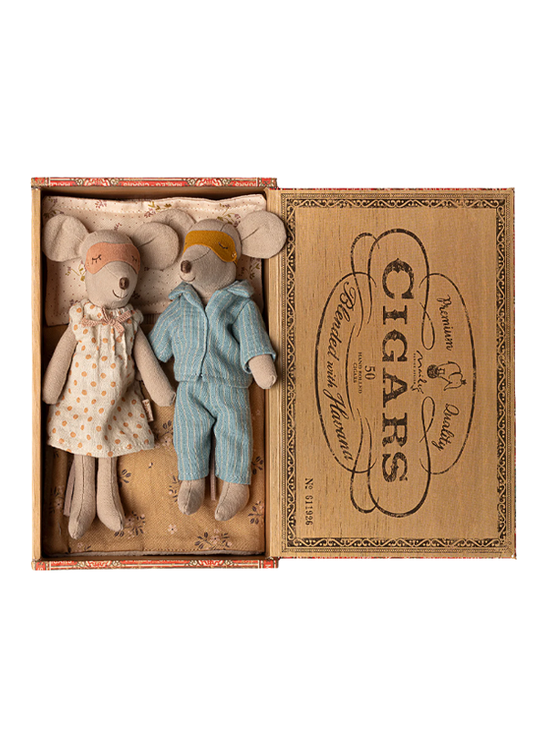 Mum and Dad come tucked inside a cozy cigar box, dressed in sweet pajamas and matching eye masks.