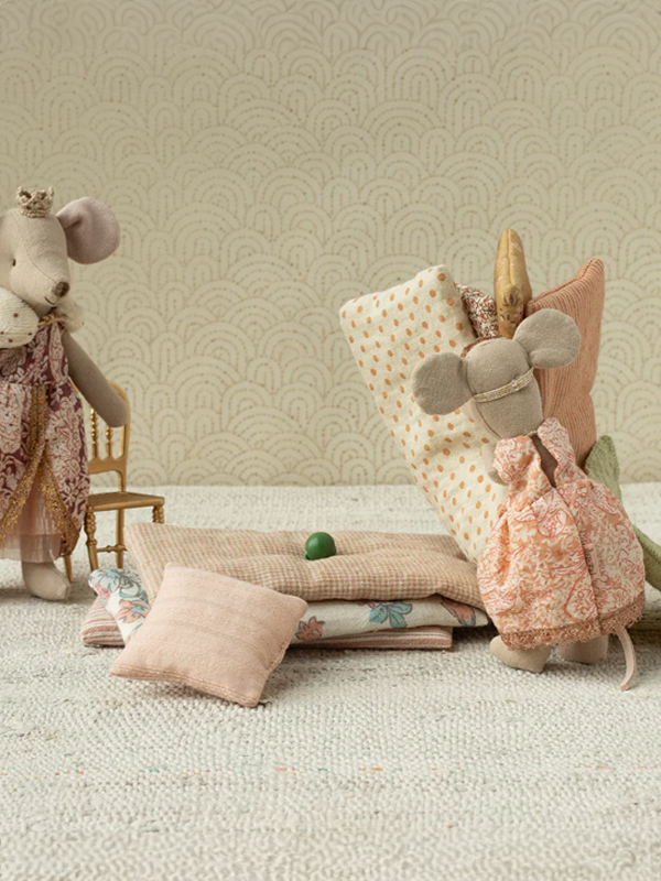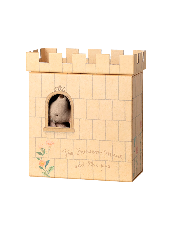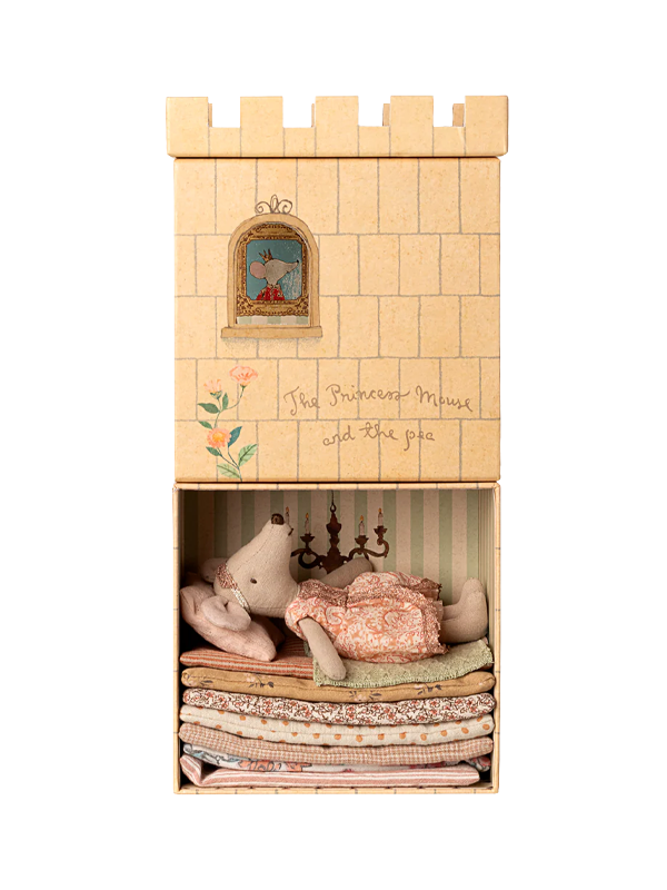 Inside the beautifully illustrated castle box, you’ll find a big sister Princess Mouse dressed in an elegant gown, along with a stack of 7 soft mattresses made from different fabrics and the tiniest pea hidden beneath. The castle doubles as her royal bedroom, complete with delicate, illustrated details.