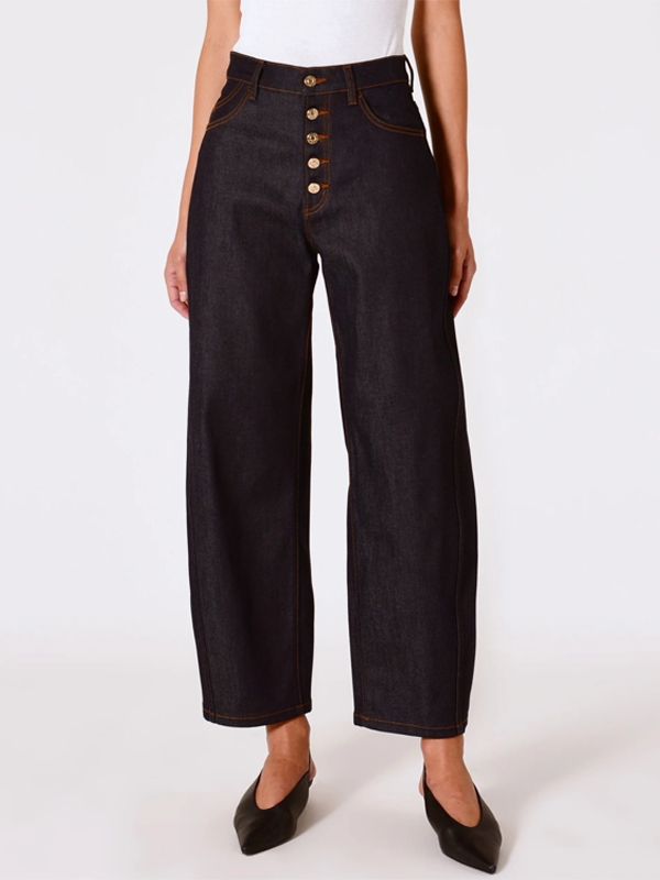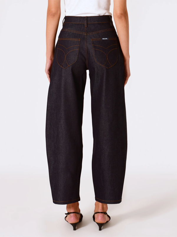 High-rise silhouette with a flattering, fitted seat and a sculptural, perfectly subtle barrel leg. ✨